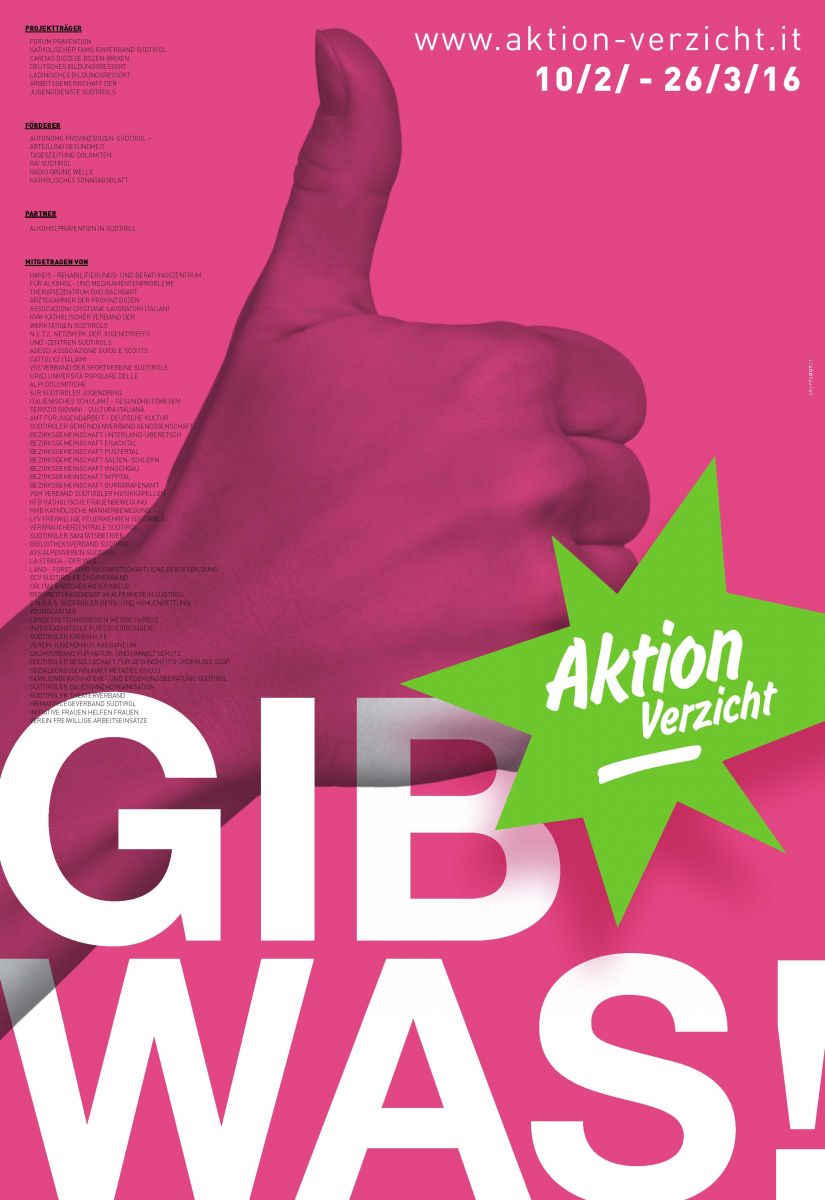 „Gib was!“ Diesen Aufruf werden insgesamt 54 Südtiroler Einrichtungen im Rahmen der „Aktion Verzicht 2016“ an die Südtiroler Bevölkerung richten. Damit macht die Aktion, die es mittlerweile seit zwölf Jahren gibt, wieder einen Schritt weiter und regt dazu an, den persönlichen Verzicht zu einem Mehrwert für die anderen zu machen.