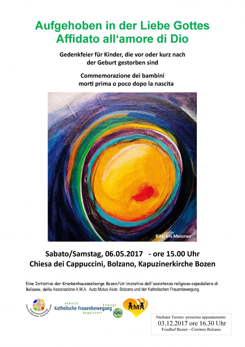 Die Feier findet am Samstag, 6. Mai 2017 um 15.00 Uhr in die Kapuzinerkirche in Bozen statt. Alle betroffenen Eltern, Geschwister und Angehörige sind dazu herzlich eingeladen. Die zweisprachige Wortgottesfeier wird von der Krankenhausseelsorge, der Associazione A.M.A. und von der Katholischen Frauenbewegung mitgetragen.