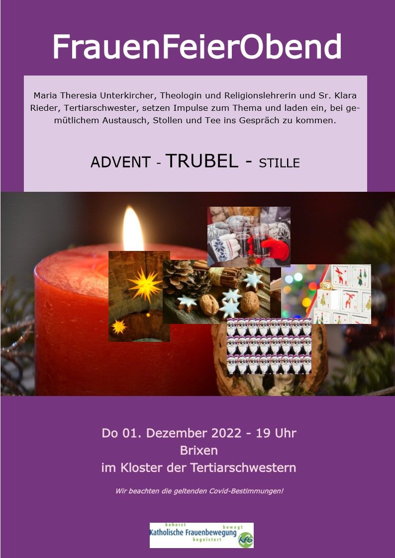 Maria Theresia Unterkircher, Theologin und Religionslehrerin und Sr. Klara Rieder, Tertiarschwester, setzen Impulse zum Thema und laden ein, bei ge-mütlichem Austausch, Stollen und Tee ins Gespräch zu kommen.