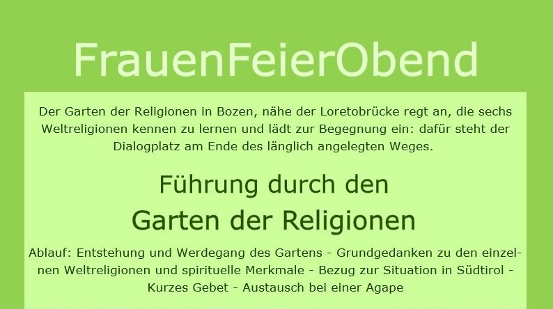 Ablauf: Entstehung und Werdegang des Gartens - Grundgedanken zu den einzelnen Weltreligionen und spirituelle Merkmale - Bezug zur Situation in Südtirol - Kurzes Gebet - Austausch bei einer Agape