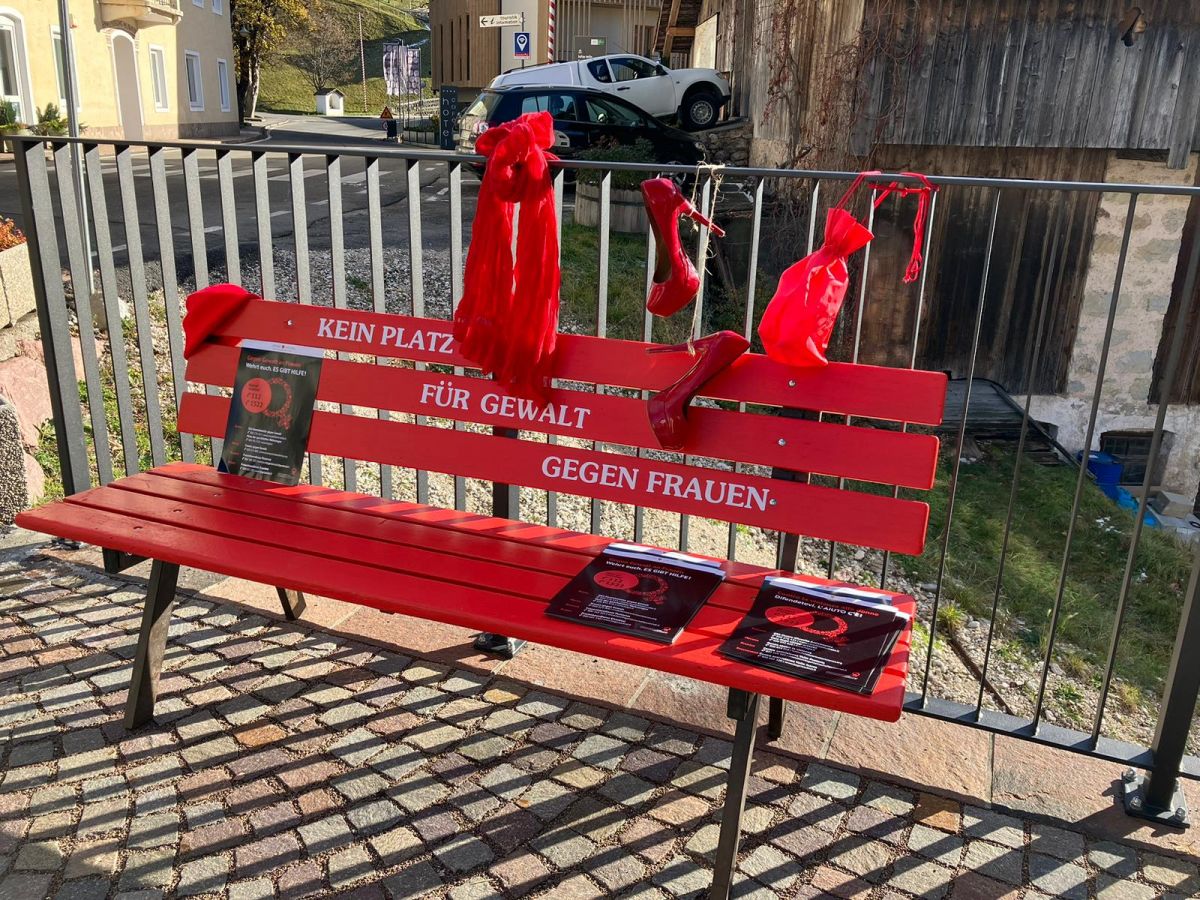 Eine rote Bank "Kein Platz für Gewalt gegen Frauen" wurde von der Gemeinde Tiers in Zusammenarbeit mit der Kath. Frauenbewegung auf dem Dorfplatz aufgestellt. Sie ist eine der vielen Aktionen, die anlässlich der „16 Tage gegen Gewalt an Mädchen und Frauen“ von 25. November, dem „Internationalen Tag gegen Gewalt an Frauen“, bis 10. Dezember, dem „Internationalen Tag der Menschenrechte“ stattfinden.