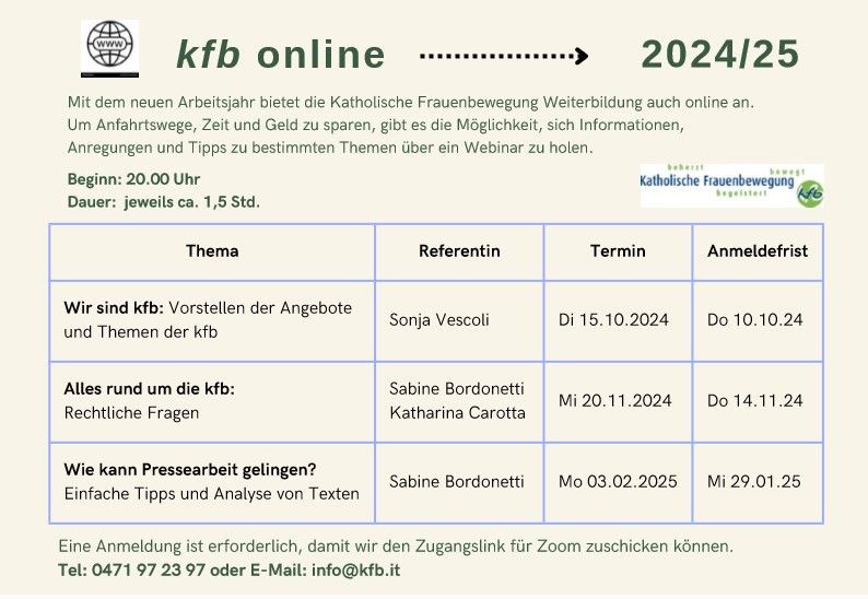 NEU! Die kfb bietet Weiterbildung jetzt auch online an. Es gibt die Möglichkeit, sich Informationen, Anregungen und Tipps zu bestimmten Themen über ein Webinar zu holen.