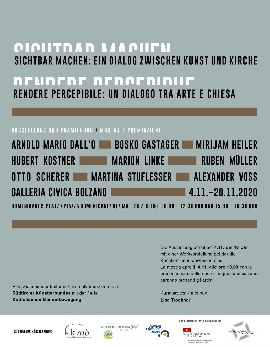 Eine Kooperation des Südtiroler Künstlerbundes und der Katholischen Männerbewegung: Preisgekrönte Kunstwerke zum Thema Kunst und Religion werden in einer Ausstellung zugänglich gemacht. Ab 4. November werden in der Stadtgalerie Bozen die aus 177 Einsendungen ausgewählten Werkneuproduktionen vorgestellt. Der Wettbewerb wurde im September 2019 vom Südtiroler Künstlerbund und der Südtiroler Katholischen Männerbewegung in Zusammenarbeit mit der Katholischen Frauenbewegung und Südtirols Katholischer Jugend ausgeschrieben. Das Projekt ist ein Versuch, eine zeitgenössische sakrale Bildsprache zu etablieren.