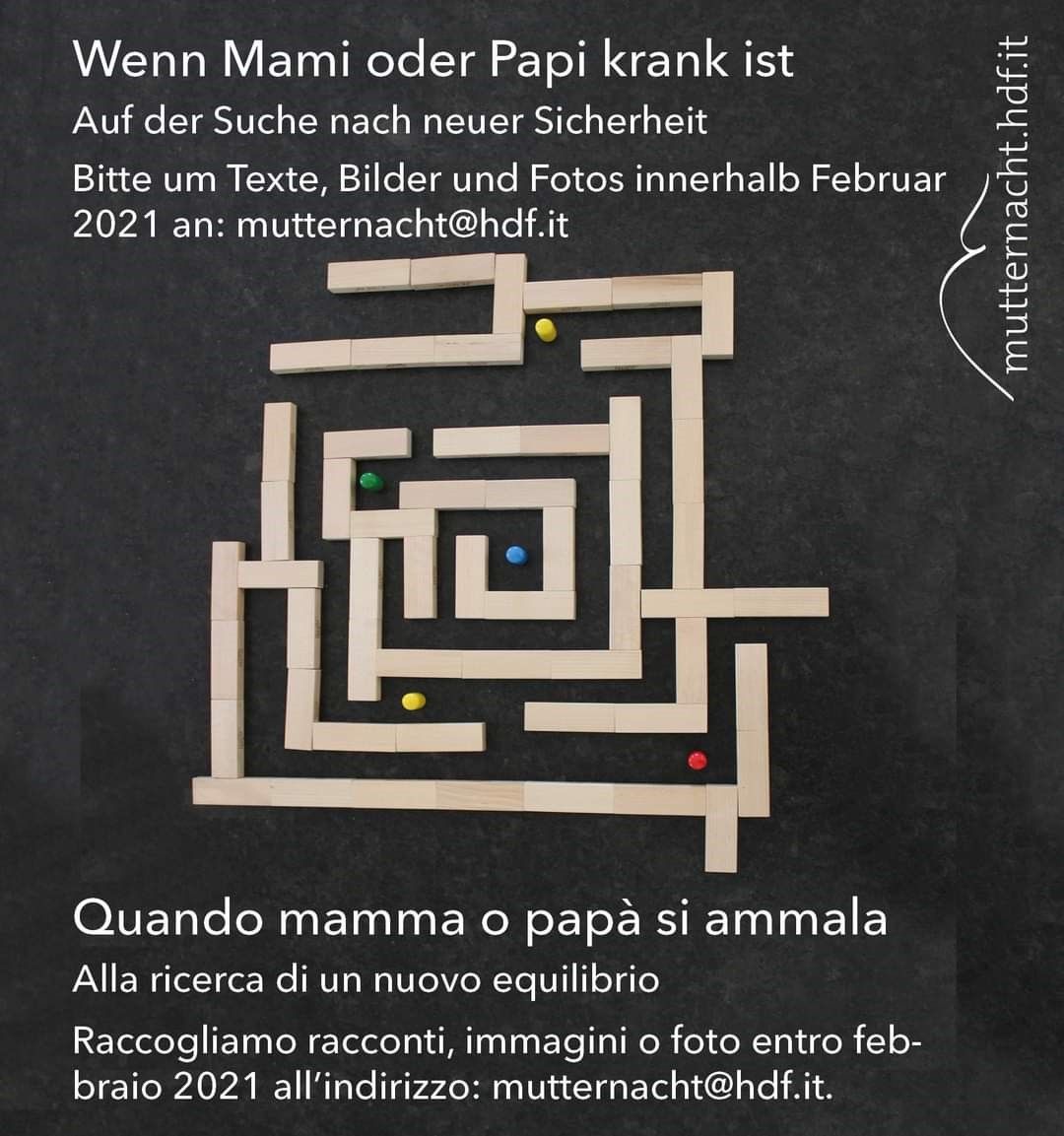 Betroffene Erwachsene, Jugendliche und Kinder sind eingeladen, bis Ende Februar 2021 von ihren Erfahrungen zu schreiben, zu zeichnen oder auch Fotos einzureichen - gerne auch anonym. Daraus entsteht ein Buch, das beitragen soll, das Tabu aufzubrechen. Die Beiträge können an folgende Adresse Email-Adresse geschickt werden: mutternacht [at] hdf.it. Für weitere Fragen können sich alle Interessierten an die Projektleiterin Astrid Di Bella, Tel. 333 235 9589 wenden.