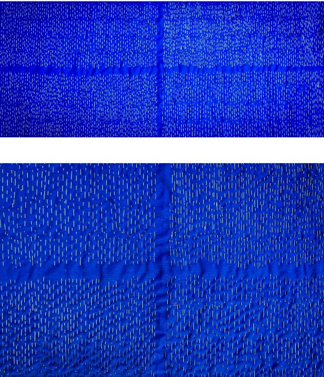 Erstplatzierte ist Martina Stuflesser mit ihrem Werk "Stecknadeln auf blauer Schürze". Auf blauem Stoff zentriert die in Gröden geborene und dort lebende Künstlerin mit Stecknadeln ein Kreuz. Je nach Lichteinfall ist das Kreuz von Glanz und Schimmer umhüllt. Das Kreuz als starkes Symbol der Christenheit zwingt sich in dieser künstlerischen Bearbeitung nicht auf, ja, es hat nahezu etwas Friedliches an sich. Aber Kreuz bedeutet auch Schmerz. Die Stecknadeln verkörpern die Dornenkrönung und Kreuzigung Christi, gleichzeitig auch den Schmerz der Menschheit, in unserer Zeit. „Das Kreuz in seiner abstrakten Darstellung gehört dem Betrachter und lässt es `begreiflich` machen“, lautet die Botschaft der Künstlerin. Diese Botschaft wird verstärkt durch den traditionellen blauen Schurz, der als Bildträger dient.