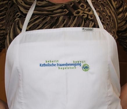 Weiße kfb-Schürze mit dem Schriftzug und dem Logo der kfb.